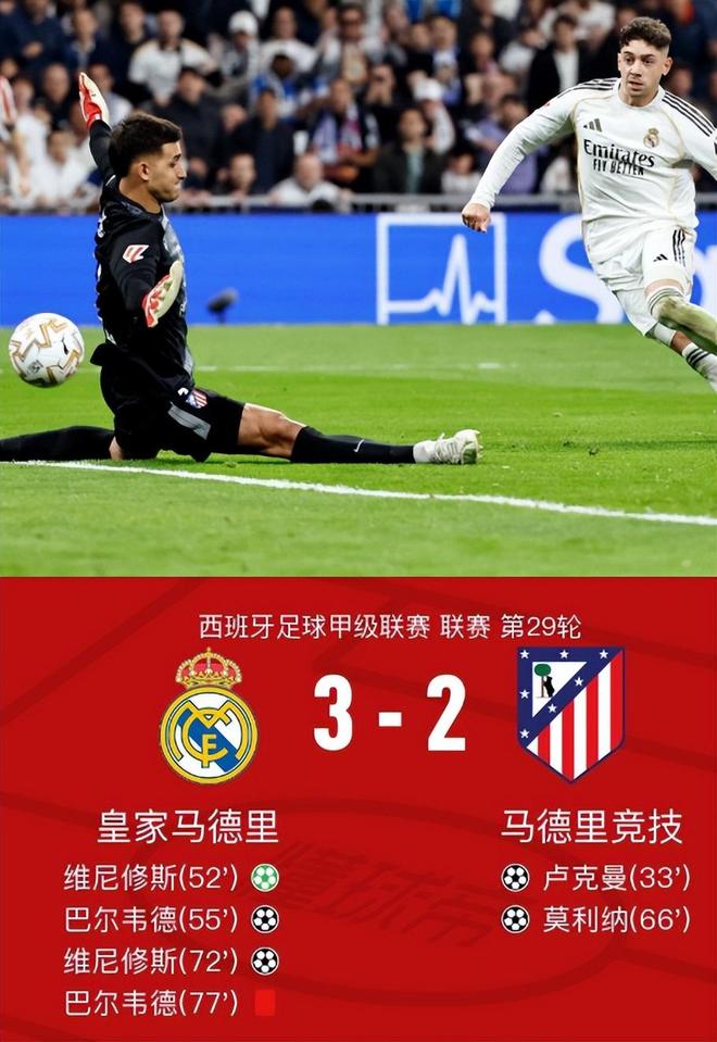 - 2026年03月23日 距榜首4分!十人皇馬3-2逆轉馬競 維尼修斯雙響巴爾韋德破門+直紅